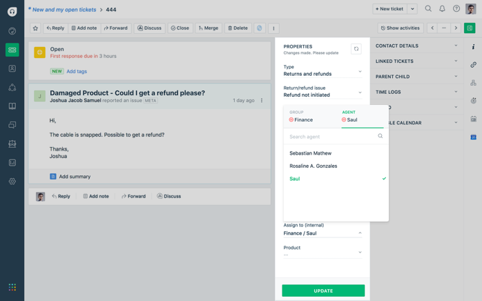 Frontline support agents are updated constantly while backend teams continue working on shared tickets so your agents always have an answer.