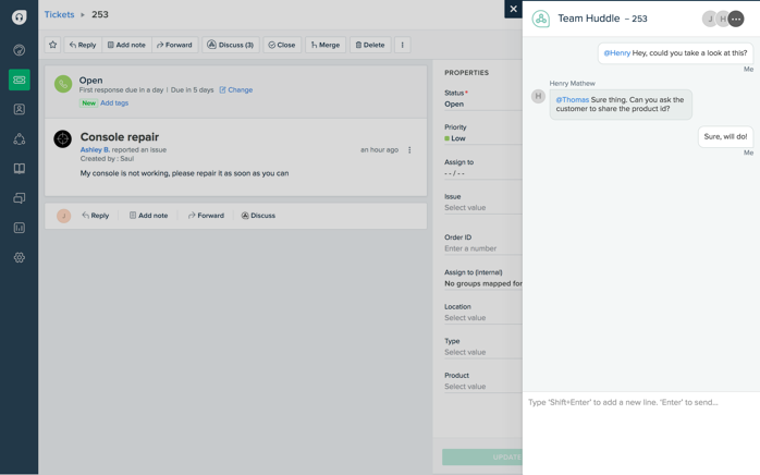This Freshdesk-exclusive feature lets your agents chat right next to the ticket, enabling better collaboration between teams.